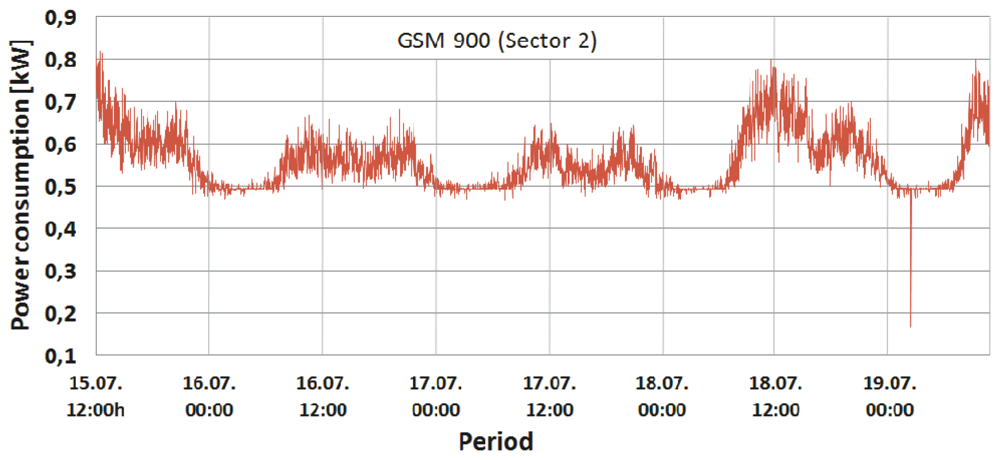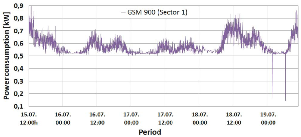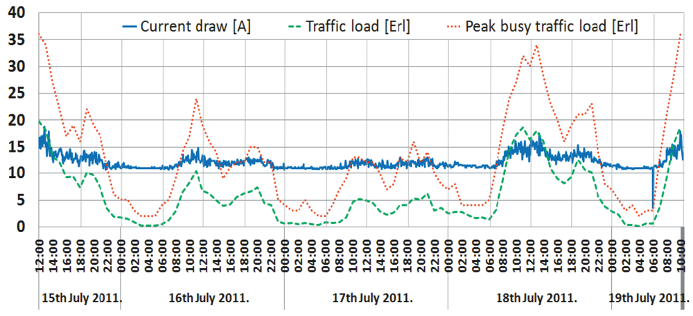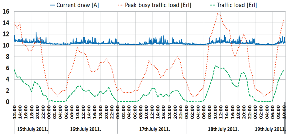 In terms of generating voice or data traffic, user activity during the first quarter of a day is low and the current draw of the BSs will be lower. On the other hand, during peak hours, user activity is high and BSs' consumption of the electric current becomes higher. The explanation of such behaviour can be found in the additional hardware and processing resources that must be activated by a BS in order to accommodate increased traffic load. Therefore, typical day/night variations in the user's activity have an influence on the BSs' power consumption.