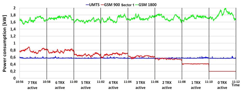 Additional measurements were performed on the DC side of the BS site in order to deduce the influence of the individual TRXs' consumption on overall BS power consumption. The TRX is the most energy-demanding part of the BS hardware and in Section 5.1 we show that number of TRXs inside the BS cabinet has an influence on the overall power consumption. To show the impact of the number of TRXs on BS power consumption, we performed simultaneous measurements of current draw on three BSs: GSM 900 (Sector 1), GSM 1800 and UMTS. After every two minutes of continuous measurement, we separately turned off one by one the TRXs of the GSM 900 and 1800 BSs until all the TRXs were switched off. Measurements were done during the peak hours (10:56–11:45) of a working day, since results presented in Figures 4–10 show the highest influence of the traffic load on the power consumption during that period.