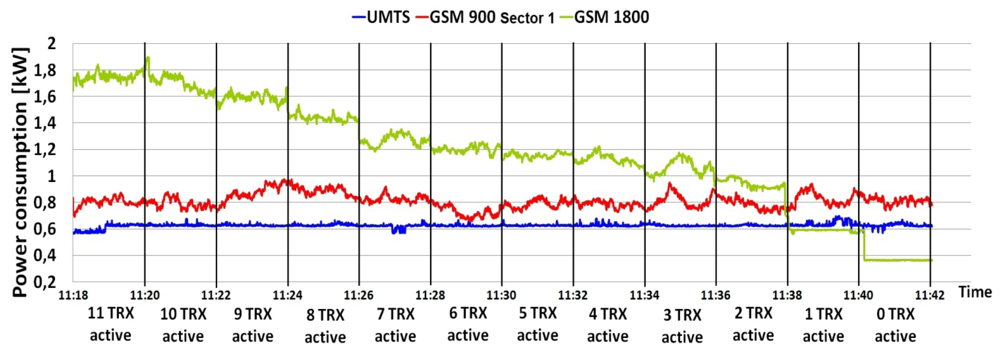 Figure 11 presents the measurements obtained in the case when TRXs of the GSM 900 (Sector 1) BS were sequentially deactivated. As expected, instantaneous power consumption by the GSM 900 BS decreases after turning off each consecutive TRX by approximately 50 W. Similar behaviour of the instantaneous power consumption with a somewhat faster decrease trend (approx. 100 W decrease steps) can be observed in Figure 12 when TRXs of the GSM 1800 BS were deactivated. Higher decrease steps for the case of the GSM 1800 BS are due to the higher traffic load served by this BS and different TRX technology.