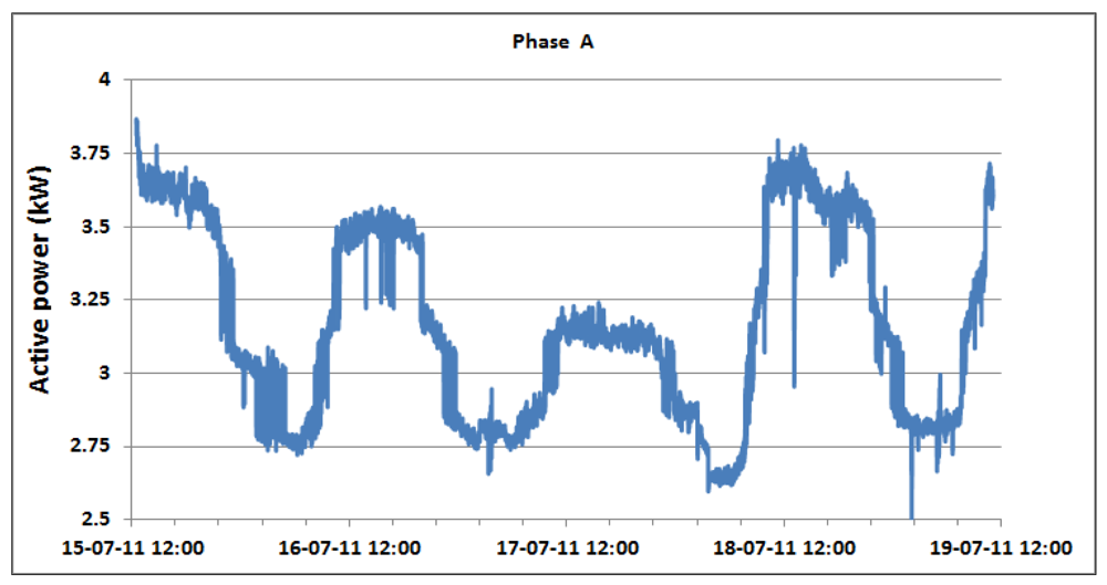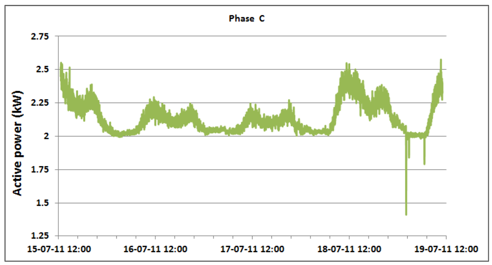 In order to focus on the daily consumption, active power is analyzed for the individual phases within the 24 h period in Table 3. These results do not significantly differ from the average active power within the total five day period (Table 4). As an example, we will comment on the statistics for Monday (July 18). Observed average values are 3.23 kW, 2.18 kW and 2.19 kW for phases A, B and C, respectively. As has already been pointed out in the analysis of the total active power consumption, the approximately 1 kW higher consumption in phase A is caused by the air-conditioning system. Maximum active AC power consumption on Monday for phase A equals 3.79 kW and for phases B and C is 2.55 kW. These power consumptions were recorded simultaneously in each phase at 11:20. The minimum active power had a magnitude of 2.60 kW for phase A and 2.00 kW for phases B and C.