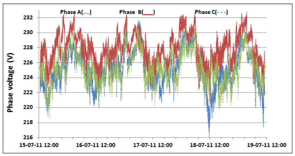 As a direct consequence, variations in the measured active power are primarily caused by the previously presented variations in the power consumption of the individual BSs. Small variations of phase voltages presented in Figure 16 give negligible contribution to variations of active power consumption. In addition, somewhat more visible variations are in phase A where oscillations are generated by the air-conditioning system connected in that phase. In Table 3, we present statistics of the active AC power consumption for each day during which continuous measurements were performed. Applying the detailed analyses presented in Table 3, in Table 4 we present results for the average active power consumption of the complete BS site for each of the phases. According to Table 4, average AC active power of the complete BS site during continuous five day measurements is: 3.16 kW, 2.14 kW and 2.14 kW for phases A, B and C, respectively. As can be seen from the calculated averages presented in Table 4, the average consumption for phases B and C is equal.