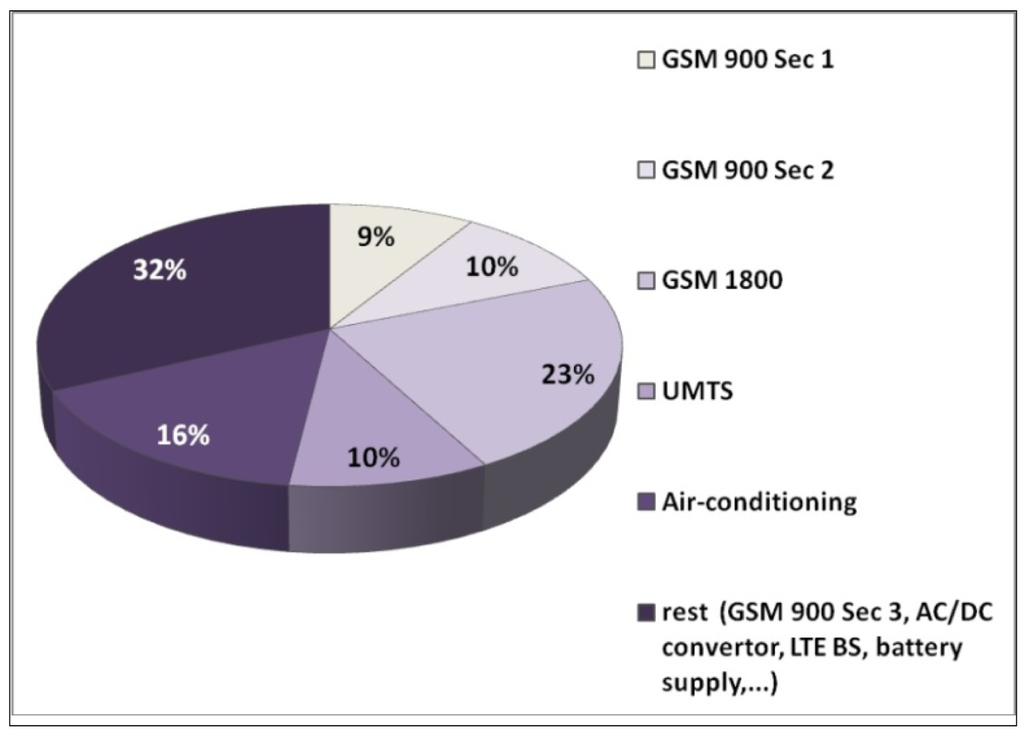 Aiming for a better understanding of the active power consumption of the complete BS site, we examine distribution of the active site power consumption among the different equipments installed on the analysed macro BS site. Figure 17 shows the percentage of the active power consumption in the site's total AC power consumption, for each of the analyzed equipments. According to Figure 17, a major fraction (52% cumulatively) of the total site consumption is caused by the analyzed telecommunication equipment, namely the GSM 900 sector 1 and 2, GSM 1800 and UMTS BSs. In addition, if we take into consideration other BSs installed on site (GSM 900 sector 3, tentative LTE), this percentage reaches values of up to 80%. A significant part of the overall consumption, around 16%, originates from the air-conditioning system, while a small percentage of the total site consumption is attributed to the AC/DC converter and battery supply system.