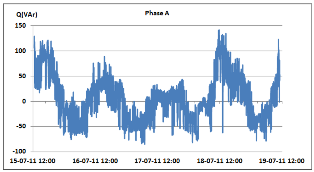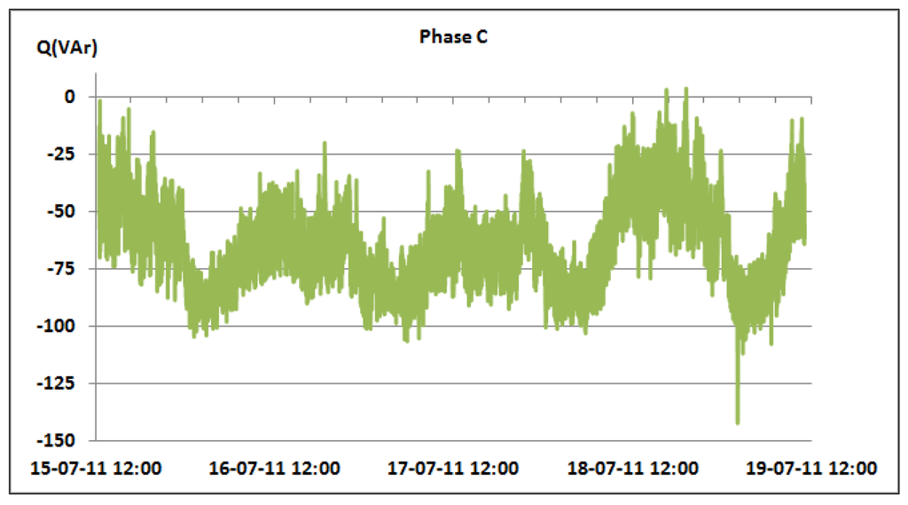 Changes in the reactive power consumption of the overall BS site for phases A, B and C are shown in Figures 18–20, respectively. Table 6 presents measured daily and total AC reactive power consumption for each of the phases. Compared with the measured values for the active power consumption (Tables 3 and 4), the reactive power consumption (Table 6) is approximately two orders of magnitude lower. Reactive power is caused by non-linear loads. Typical representatives in telecommunications are so-called switching power supplies used for powering equipment installed on the BS site. The switching power supply is an electronic power supply with an embedded switching regulator used for conversion of the electrical power. Similar to a conventional linear power supply, the switching supply transfers power from the electrical power grid to a load, which is typically some electronic device. Contrary to the linear power supply, the transistor of the switching power supply alternates rapidly from ON to OFF state. This approach results in minimal energy waste. However, switching currents generated by this type of supply cause electrical noise and, if not particularly treated, generally reduce the power factor. Hence, oscillations in the reactive power can be attributed to the operation of the mentioned electronic non-linear loads.