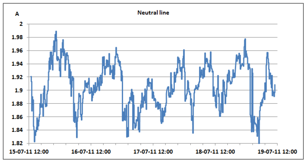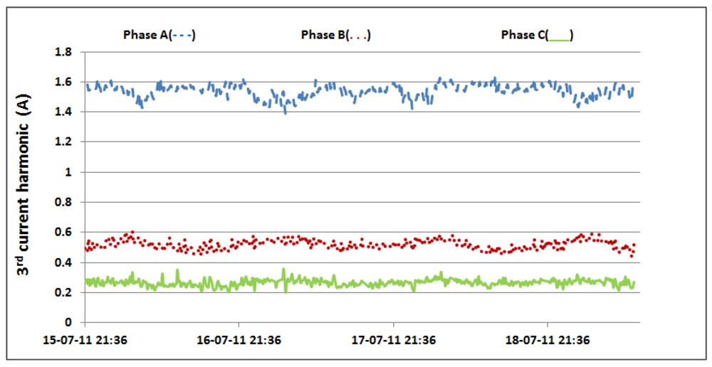 Nevertheless, in our case calculated total harmonic distortion for voltage (THDV) is equal to 1.85%, 1.84% and 1.82% for phases A, B and C, respectively. This proofs negligible influence of the voltage distortions on the higher current harmonics. Figure 21 shows TRMS measurements of the 3rd current harmonic measured in the individual phases. Due to the nature of the three-phase supply system, contributions of the 3rd current harmonics coming from the individual phases are summed in the neutral line, resulting in increased heating of the neutral line [22]. Because of that, it was reasonable to investigate the magnitude of the 3rd current harmonic in the neutral line, as shown in Figure 22.
