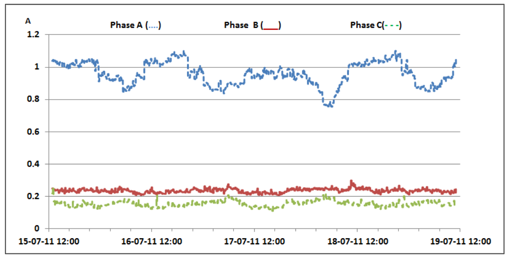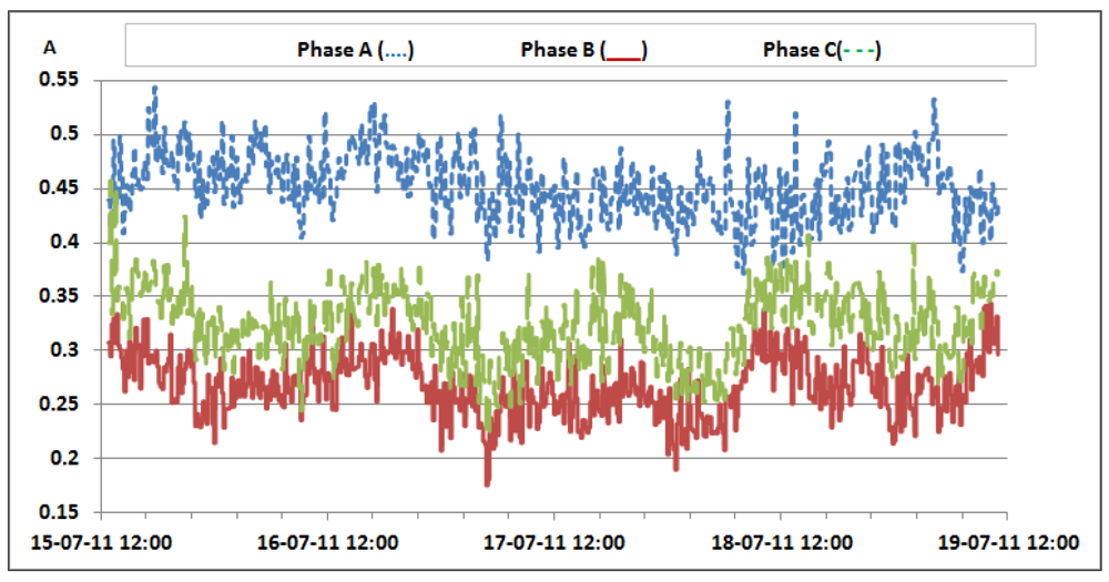 The neutral conductor of the supply system was additionally inspected and it was found to have a proper diameter to support the 3rd current harmonic. The presence of the 5th and 7th harmonic, measured in the individual phases, whose TRMS values are reported in Figures 23 and 24, further proves the existence of the non-linear loads [23]. Higher values in phase A are generated by the air-conditioning system. Nevertheless, it can be noticed that AC/DC converters and supporting circuitry provide stable filtering and DC conversion. This means that traffic variations do not have a significant influence on generation of the current harmonics, which results in their negligible influence on supply of the BS racks.