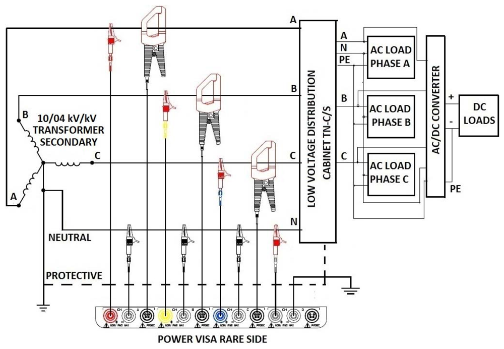 The measuring scheme according to which measurements of the power consumption on the AC side of the BS site were performed can be seen in Figure 3. As presented in Figure 3, the voltage channels were connected to phase voltages, while phase currents were measured using current clamps. Since in-situ measurements showed higher current consumption in the phase A (non-symmetric load), the neutral line current was expected to be non-zero and an additional current clamp was placed on the neutral line. In addition, from in-situ measurements it was found that overall site power consumption is dominated by the BS racks as well as the air-conditioning system. Site lighting is based on neon-bulbs normally kept off, except during rare maintenance activities. Therefore, site lighting including safe light consumption can be treated as negligible.