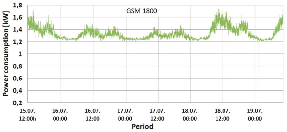 From Figures 4–7 it can be seen that the highest power consumer is the GSM 1800 BS. Compared with the BS consumption of the other technologies, this BS has more than twice higher instantaneous power consumption at any moment. This is because the GSM 1800 cabinet serves all three sectors concurrently through configuration with 4 transceivers (TRXs) per sector (4/4/4). Since each TRX has a separate power amplifier, and in Section 2 we show that the power amplifier has the highest share in the BS power consumption, the number of TRXs has an important influence on the total BS power consumption.