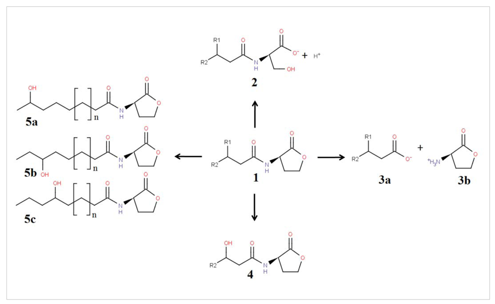 According to Dong and Zhang, the chemical structure of AHLs suggests that four different ways of degradation may occur mediated by lactonase, decarboxylase, acylase and deaminase [29]. Of these, only two types of QQ enzymes have been found, namely lactonase and acylase. The former hydrolyzes the lactone and the latter acyl chains (Figure 1). An AHL lactonase hydrolyzes the ester bond of the lactone ring, forming acyl homoserine, which renders the signalling molecules incapable of binding to their target transcriptional regulators, thus attenuating the QS mechanism [30,31]. An AHL acylase, also known as AHL amidohydrolase, cleaves the peptide (amide) bond of the lactone ring to release a fatty acid and homoserine lactone, causing significant reduced function of the signalling molecule [32].
