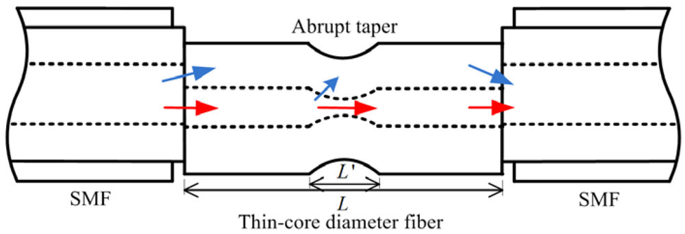 The structure of the proposed RI sensor is shown in Figure 1. A section of uncoated commercial TCF is spliced between two sections of SMFs. At the SMF-TCF interface, part of the light can be coupled to the cladding of the TCF as cladding modes due to mode mismatch. After propagating through the TCF, the excited cladding modes will be re-coupled to the core of the SMF at the second spliced point. The cladding modes will interfere with the core mode due to the phase difference, which can be described as: