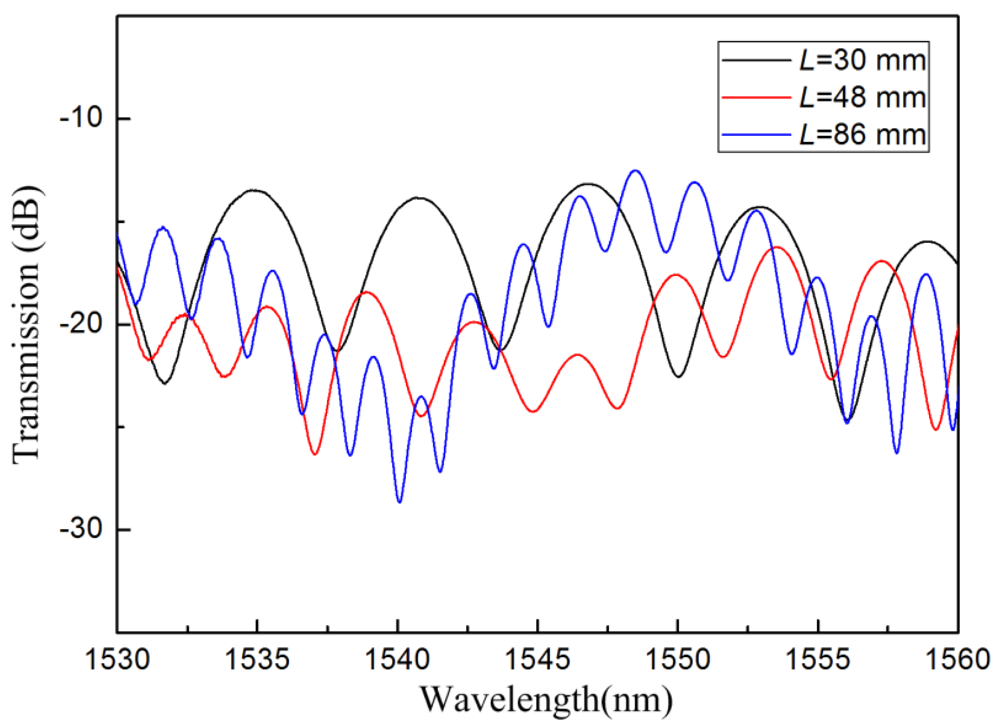 The TCF used in our experiment is a commercial fiber (Yangtze Ltd., Wuhan, China). It has core/cladding diameters of 4.8/125 μm, and the cut-off wavelength is 1,260 nm. An Ericsson fusion splicer (modal FSU 975), with a built-in core-offset attenuator program, was used to produce the lateral offset between the SMF and the TCF. A C-band light source was used as the broad band source, and the output spectrum was monitored by an optical spectrum analyzer (OSA, Yokogawa, Japan) with wavelength resolution of 15 pm. The transmission spectra of the IMIs with different TCF lengths were measured and are shown in Figure 2. It can be seen that the free spectral range decreases with the increasing interference length. In addition, the interference spectra are a little inhomogeneous. This is because that more than one cladding modes are available in the interference pattern.