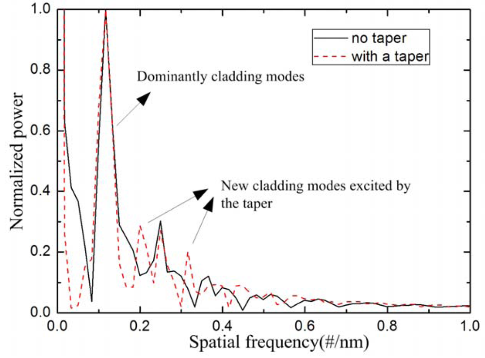 The interference patterns in Figure 4 are Fourier transformed to obtain the spatial frequency, as shown in Figure 5. It can be found that there is only one dominantly cladding mode, along with other weakly cladding modes. Take the solid line as an example, the dominantly cladding mode is excited at the spatial frequency of 0.116 #/nm. Meanwhile, other weakly cladding modes are also excited with the spatial frequencies of 0.249 #/nm, 0.366 #/nm, etc. After tapering the TCF, two new cladding modes (spatial frequency at 0.199 #/nm & 0.316 #/nm) are excited, whose orders are higher than that of the dominantly cladding mode because their spatial frequencies are larger than the dominantly cladding mode [18]. The new excited cladding modes will slightly change the main interference pattern. Wu et al. [15] simulated the effective RI change of the cladding mode for the same RI change of the surrounding medium. The effective RI change of the LP0,10 is 25 times higher than that of LP0,3, which means that the higher order cladding modes exhibit higher RI sensitivity. Due to the higher order cladding modes being excited, the RI sensitivity can be improved by adopting the abrupt taper in the TCF.