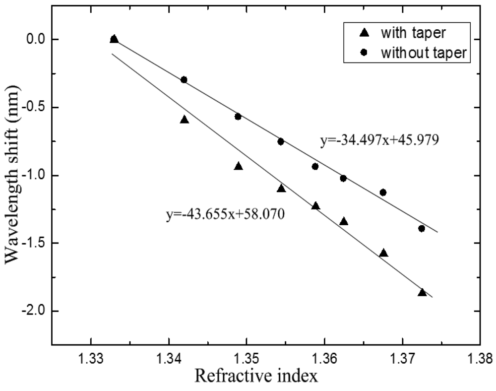 The IMI with the TCF length of 38 mm was employed to evaluate its RI sensitivity. We used solutions of glycerol and water mixture as samples, whose RI ranged from 1.333 to 1.3725. The refractive indices of the samples were measured using an Abbe refractometer with the wavelength of 589 nm, and the accuracy of the refractometer was 0.001. The sensor head was mounted on a glass plate with glue to keep it straight, and it was immersed into the mixed solutions. The entire measurement was carried out under a constant temperature to avoid the impact of temperature. The spectral responses to different RI values were recorded by the OSA. The IMI was carefully cleaned with alcohol and water after each RI measurement. Then, the sensor head was tapered in the center of the TCF. In order to make a comparison, the RI experiment was repeated by using the same sensor head after the TCF was tapered. The operating procedure was as same as that of the sensor head with no taper. The maximum wavelength shifts of the transmission dips with the variation of the RI are plotted in Figure 6. The correlation coefficient squares reached 0.994 and 0.978, respectively. The result shows that the RI sensitivity can be significantly improved by tapering the TCF. And the wavelength shift is enhanced from −0.345 nm to −0.437 nm for 0.01 change of RI.