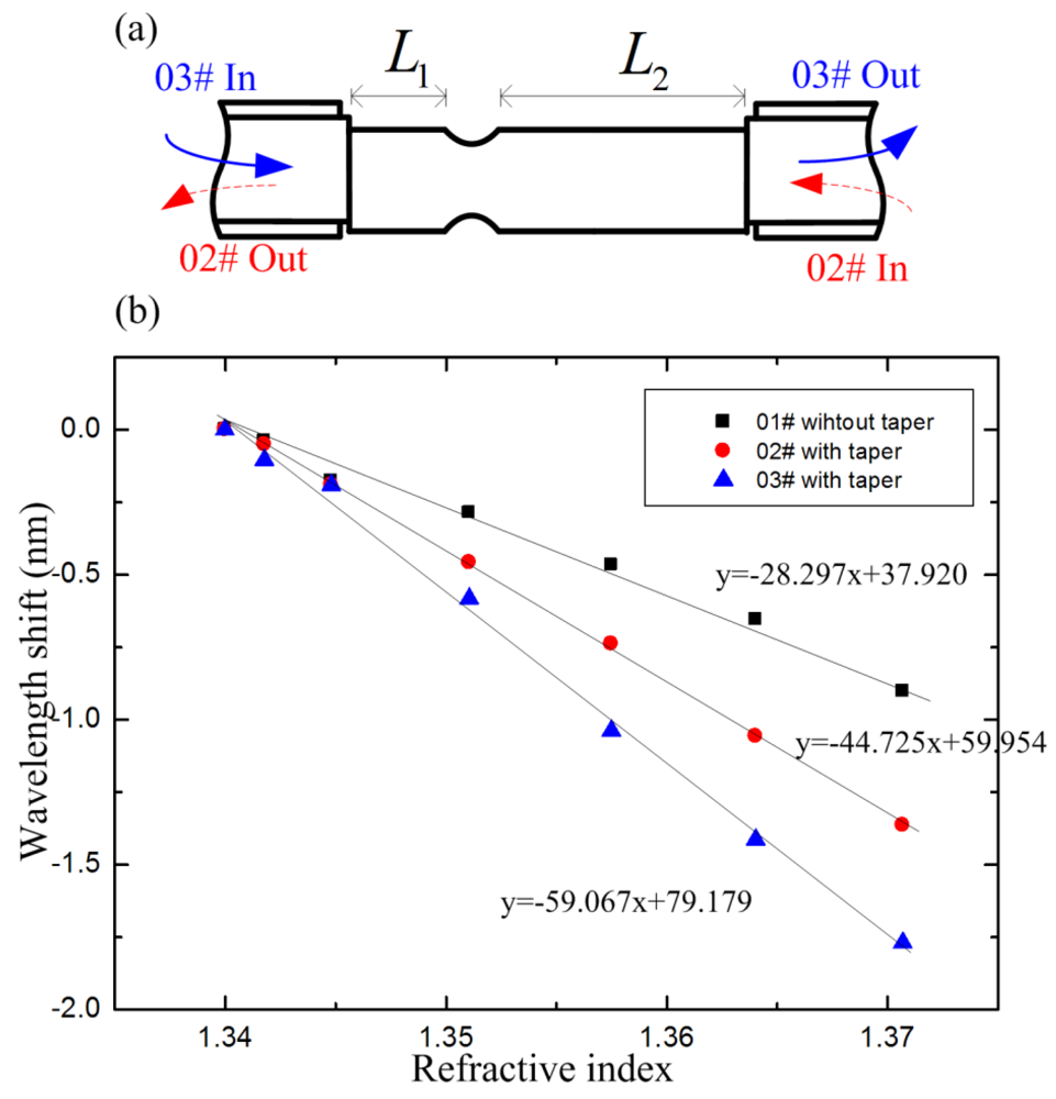 To characterize the impact of the taper position on RI sensitivity, we have fabricated another IMI, and the taper area was not in the center of the TCF, as shown in Figure 7(a). The taper has the length of ∼750 μm and the twist diameter is ∼80 μm; L1 and L2 are 13.5 mm and 17.7 mm, respectively. We did three groups of RI experiments with the same sensor head. Firstly, the IMI was used as a RI sensor before being tapered (01#). Secondly, the light was led in from the right side of the sensor after the TCF was tapered (02#). Thirdly, the light was led in from the left side of the sensor (03#). The spectral responses are plotted in Figure 7(b). The sensitivities of the three groups of RI experiments are −0.283 nm, −0.447 nm and −0.591 nm for 1% change of RI, respectively. Correlation coefficient squares of 0.991, 0.999 and 0.996 were obtained. Figure 7(b) indicates that the sensing sensitivity can be significantly improved by tapering the TCF. The sensing sensitivity is also affected by the taper position in the TCF. The wavelength shifts of 02# and 03# can be written as , and . Due to the symmetrical structure of the abrupt taper, the new excited cladding modes for 02# are suppose to show same sensitivity to the surround medium. Thus, the of 02# equals to that of 03#. L2>L1, so δλ2>δλ3. As a result, the sensing sensitivity of 02# is higher than that of 03#.