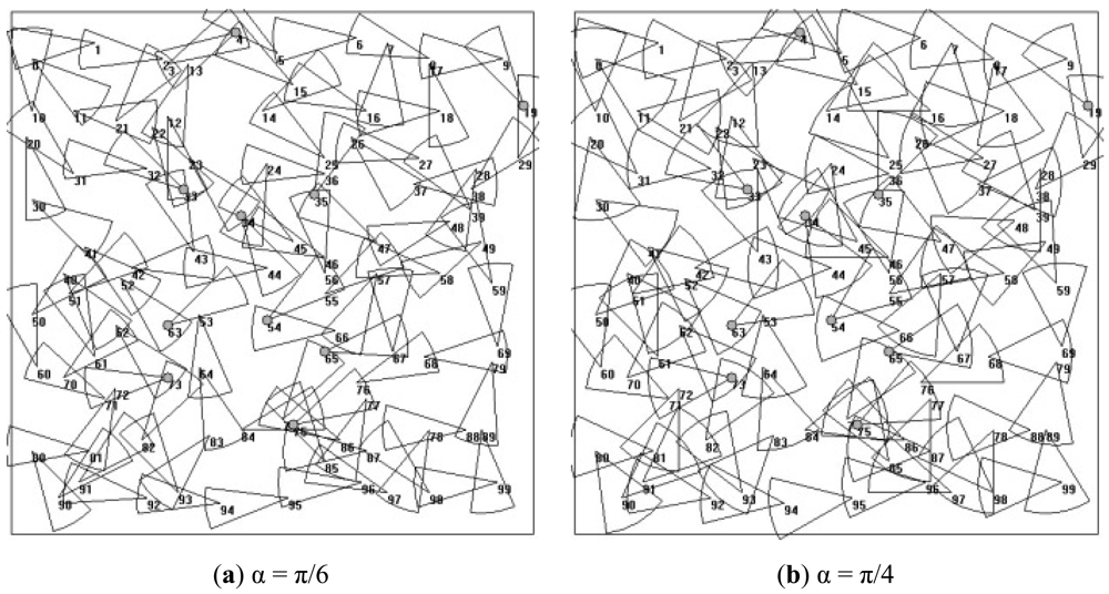We consider a rectangular area of 100 × 100 m2 in which 100 sensor nodes are deployed with network connectivity. It means that first each sensor node has at least one path to reach the BS. 10% of the nodes are chosen randomly as CHs. A simple scenario in monitoring application is simulated, which is that each sensor node transmits its sensed data to the BS every 25 s. The length of data packet is fixed at 2,048 bits and the initial energy of each node is 10−3 J. To examine the performance influenced by the scanning angle, which is the main factor of directional communication, the scanning angle is set to , , , , respectively. Ten different topologies are generated and the results are based on the average. An example of the simulated topology is shown in Figure 8.