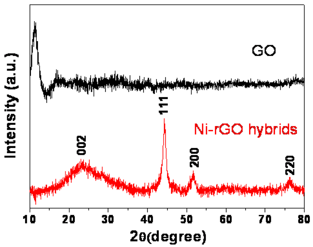 The XRD patterns of the as-prepared GO and Ni-rGO nanohybrids are shown in Figure 1. For GO, the characteristic peak at around 11.3° (the d-spacing is about 0.79 nm) is consistent with the interlayer spacing of GO sheets reported previously, which may be ascribed to the existence of oxygen-rich groups on both sides of the sheets and water molecules trapped between the sheets [].