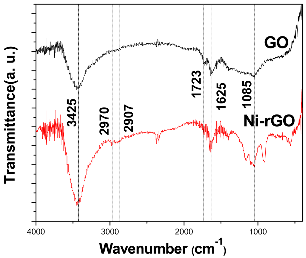 Figure 2 shows the FT-IR spectra of the as-prepared of GO and Ni-rGO nanohybrids. The broad absorptions at about 3,425 and 1,625 cm−1 are assigned to the hydroxyl groups of absorbed H2O molecules, and the peaks around 2,970 and 2,900 cm−1 can be assigned to the asymmetric and symmetric vibrations of C-H, respectively. The absorption band at 1,087 cm−1 can be assigned to the stretching vibration of C-O. The C=O vibration band at 1,723 cm−1 disappears after hydrazine hydrate reduction of exfoliated GO, indicating that the reduction of GO to rGO is complete [].