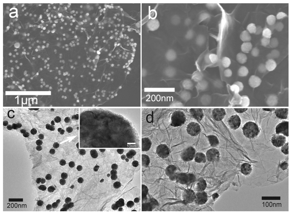 The SEM images reveal the morphology of the Ni-rGO nanohybrids prepared by our one-step microwave-assisted method. The low magnification SEM image (Figure 3(a)), reveals that the GO sheets are well exfoliated and nearly monodispersed Ni nanospheres are anchored uniformly on the surface of the rGO sheets. Observation under higher magnification (Figure 3(b)) shows the well-dispersed Ni spheres with a diameter of about 80 nm on the wrinkly rGO sheets. The transmission electron microcopy (TEM) images (Figure 3(c,d)) also show that these monodiperse spheres are about 80 nm in size, while the HRTEM image (inset in Figure 3(c)) indicates that there are smaller nanocrystals attached uniformly to form nanospheres. In our study, hydrazine does not only acts as a reducing agent to form Ni nanospheres in the subsequent solvothermal process, but also plays an important role in reducing GO to rGO sheets. GO, bearing hydroxyl and epoxide groups on the basal planes, along with carbonyl and carboxyl groups along the sheet edges, readily coordinates with Ni2+ from solution. The strong reducing ability of hydrazine hydrate ensures synchronous reduction of GO and nickel ions which leads to the formation of nanohybrids []. Additionally, we believe the EG solvent selected for this experiment also acts as a surfactant [], which absorbs on the GO surface, while at the same time providing hydrophilic hydroxyl groups for the hydrolysis of the nickel precursor. Hence, GO can be used as a template for deposition of Ni nanospheres on its surface.