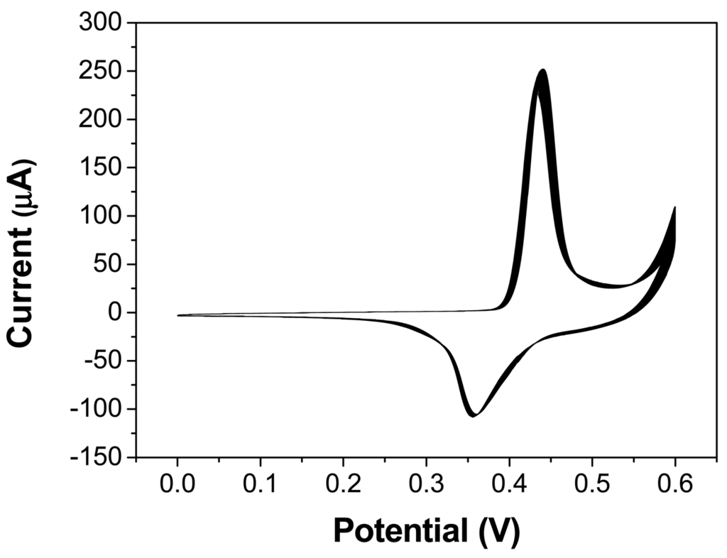 The Ni (II) species on the electrode are due to the oxidation of Ni(0). Upon addition of 1 mM glucose, there is a great enhancement of the anodic peak current and considerable decrease of cathodic peak current, which indicates that the Ni-rGO hybrids could catalyze the oxidation of glucose. The oxidation of glucose to glucolactone is catalyzed by the Ni(III)/Ni(II) redox couple, where the Ni(III) species on the electrode surface rapidly oxidizes glucose at the anode, converting Ni(II) into Ni(III) species. Thus, the change in concentrations of Ni(II) and Ni(III) ratio causes the increase of the anodic peak current and the decrease of the cathodic peak current []. In addition, the stability for the Ni-rGO hybrid-modified GCE after activation is also examined by recording 40 consecutive CV curves between 0 and 600 mV in 0.1 M NaOH at a scan rate of 0.1 Vs−1 (Figure 4). No obvious peak current change is observed, which demonstrates the Ni-rGO hybrid- modified GCE is very stable.