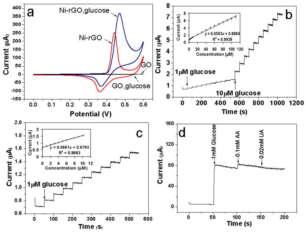 Furthermore, it is well known that AA and UA present in the biological samples could be easily oxidized at positive potential and often interfere with the detection of glucose by other methods []. To evaluate the selectivity of this sensor, the amperometric response of the Ni-rGO hybrid-modified electrode to UA (0.02 mM), AA (0.1 mM), and glucose (1 mM) on the physiological level at an applied potential of 0.5 V in 0.1 M NaOH solution is shown in Figure 5d. Compared with glucose, the current responses of these interfering species are very weak and can be neglected. Therefore, the as-prepared Ni-rGO hybrid-modified GCE also exhibits excellent selectivity for glucose detection.