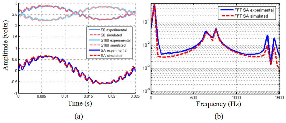 Figure 1(a) shows the signals S0 and S180 generated in the photodetectors of a four field scanning encoder and the resultant measurement signal SA(=S0 − S180) deteriorated because of the presence of a 700 Hz and 100 ms−2 sine vibration at the same time the encoder is working. For its generation, a 20 μm grating period encoder has been operated on an electrodyamic shaker. In this figure a harmonic superimposed to the measurement signals can be appreciated with a frequency equal to that of the excitation frequency. As it can be observed the amplitude of the harmonic is minimum when the photodetectors are entirely illuminated or minimally illuminated, i.e., when the lines of one of the gratings coincide with the lines or with the gaps of the other. On the other hand, when the gratings are partially superimposed the amplitude of the vibration harmonic reaches higher values. This can be easily explained thinking of the phenomenon as two independent movements going together. One movement would be that of the normal operation of the encoder, in which one of the gratings moves always forward with respect to the other grating, giving as a result a measurement signal with a frequency determined by the velocity of operation of the encoder. The other movement would be the same grating moving backward and forward repetitively with a certain displacement that depends on the frequency and severity of the vibration. This way, the first movement determines the centered relative position between the gratings at which the second movement takes place. If the lines of one of the gratings coincide with the lines or with the gaps of the other grating, this second movement will result in an alternating movement where the lines are partially coincident thus producing a minimum variation of light intensity in the photodetectors. On the other hand, if the lines of the two gratings are initially overlapping, the two utmost positions of the oscillating movement will be near the situations where the grating lines of one the gratings are coincident with the other grating's lines or with the gaps, hence producing a maximum variation of light intensity giving as a result maximum amplitude of the vibration harmonic. Figure 1(b) shows the FFT of this deteriorated encoder's measurement signal. The first peak corresponds to the velocity of 0.8 mm/s (40 Hz) of operation of the encoder and at the frequency of the vibration excitation (700 Hz) it can be appreciated that there is a doublet instead of a single peak. This doublet is a consequence of the fact that the vibration harmonic is added to the main signal when the grating moves from a situation where the photodetector is minimally illuminated towards a maximum light intensity condition, i.e., the utmost movement of the vibrating grating produces light intensity increments. On the other hand, when the vibrating grating is moving towards a minimum light intensity condition from the fully illuminated photodetector, the vibration harmonic is subtracted from the main signal. Only from a frequency domain point of view, this can be seen as if the phase of the vibration harmonic is increased by a half cycle each time the light intensity reaches a maximum or a minimum. Taking these considerations into account it is possible to approximate mathematically the effect of vibration on the measurement signals generated in the photodetectors as follows:
