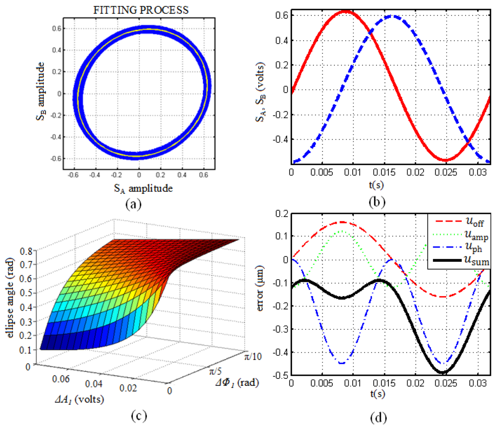 From the ellipse parameters the term ΔB1 can be estimated as , where Cx and Cy are the center components of the ellipse obtained. To calculate the contribution to the total error due to differences in relative amplitudes, the term ΔA1 has been estimated as , where Rx and Ry are the radii of the ellipse obtained and A is the ideal amplitude of the measurement signals, gotten from the ideal circle. The estimation of the term ΔΦ1 just from the fitting process is a bit more difficult process. The difficulty lies on the fact that differences of relative amplitudes tend to rotate the major axis of the ellipse to 0 radians while the phase error tends to rotate it to π/4 radians. Because both amplitude and phase errors are present in this case, the resulting rotation of the ellipse would be just a combination of the two types of errors. Through the estimation of the maximum and minimum values that these error terms can have for this encoder, an interpolating surface is determined (Figure 2(c)). Here, all the possible values of the ellipse angle that correspond to each one of the combinations considered for amplitude and phase errors are registered. Knowing the actual angle value of the ellipse obtained and the amplitude error term it is immediate to calculate the phase error term ΔΦ1 from the interpolating surface. Once all the error terms have been estimated, the offset, the amplitude and the phase errors are generated according to the set of Equation (4), taking into account the frequency relations between these errors and the fundamental operational frequency of the encoder, which can be obtained from the FFT of the measurement signals.