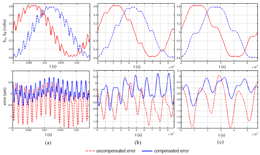 In Figure 4(a) the encoder is operating at a speed of 0.8 mm/s (40 Hz) and is subjected to a sine vibration excitation of 700 Hz. In this figure, it can be observed how the maximum and minimum errors at which the error oscillates are considerably reduced, as the encoder uncompensated error oscillates at a maximum value of 1.5 μm and is reduced to a maximum rounding 0.7 μm. In case the frequency excitation is maintained constant and the speed of the encoder is increased the algorithm works well as it can be observed in Figure 4(b,c). This case can be seen as if the fundamental frequency of the measurement signals and that of the harmonic corresponding to the vibration excitation are getting closer in the spectrum. In Figure 4(b) the speed of the encoder has been increased to 2 mm/s (100 Hz) and the compensated error shows values below those of the uncompensated case for the whole period of the measurement signals. The better performance is clear in case the speed is increased again until a value of 3.4 mm/s (174 Hz), represented in Figure 4(c). In this figure it can be appreciated how the maximum error is reduced from a value of 1.8 μm to a maximum peak of 1.0 μm, giving error values significantly lowers than the uncompensated case.