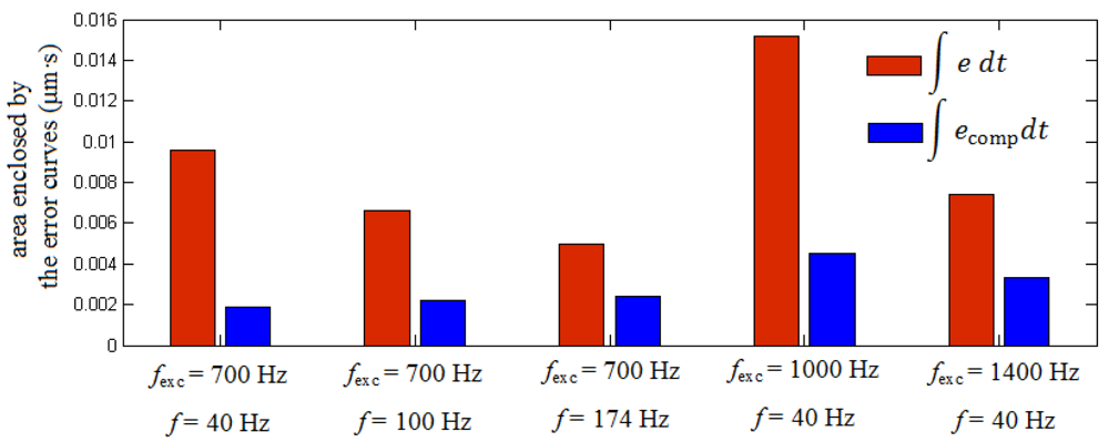 Figure 5 shows the results of the application of the algorithm when the encoder operates at a constant speed of 0.8 mm/s (40 Hz) subjected to excitation frequencies of 700 Hz (Figure 5(a)), 1,000 Hz (Figure 5(b)) and 1,400 Hz (Figure 5(c)). In these figures it can be appreciated that again the algorithm reduces the error committed by the encoder effectively, although the performance is not as good as in the case of increasing the velocity of the encoder instead the frequency of the excitation. This is due to the uncertainty inherent to the determination of the frequency excitation parameter, fexc, from the FFT of the measurement signals. This gives as a result that, if frequencies of the error and from the compensation signal do not match exactly, a certain phase is introduced between both, making the algorithm get worse as the encoder travels along the measuring length. Despite this, it is possible to reduce the error from a value of 2.3 μm to 1.3 μm for some peaks in case of 1,000 Hz of excitation frequency and from 1.8 μm to 0.9 μm in case of 1,400 Hz of excitation frequency. Instead of analyzing the performance of the method for single peaks it is more interesting to have an idea about how it performs for the whole period considered. From this point of view Figure 6 shows the area enclosed by the error curves before and after the compensation. We can see in this figure how the performance is significantly improved for all the cases considered. The best performance corresponds to the case of 700 Hz of excitation frequency with a velocity of the encoder of 0.8 mm/s, with an improvement of 80%. It has to be noticed that even for the worst cases there are still significant improvements or around 50% of the parameter considered when using the methodology proposed.