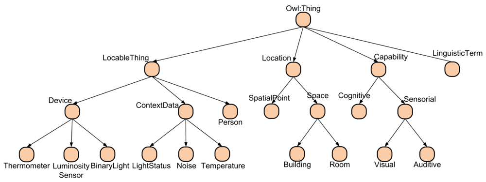 LocableThing: The subclasses of this class represent the elements of the system that have a physical location. It contains three subclasses: the Person subclass represents the users, the Device subclass models the different devices of the environment and the ContextData subclass models the measurements taken by the sensors. As we will explain in the next section, there are two types of measurements, those taken by the devices and the global measures for each room calculated by our data fusion mechanism. Figure 1 shows a subset of the type of context data taken into account in the ontology.