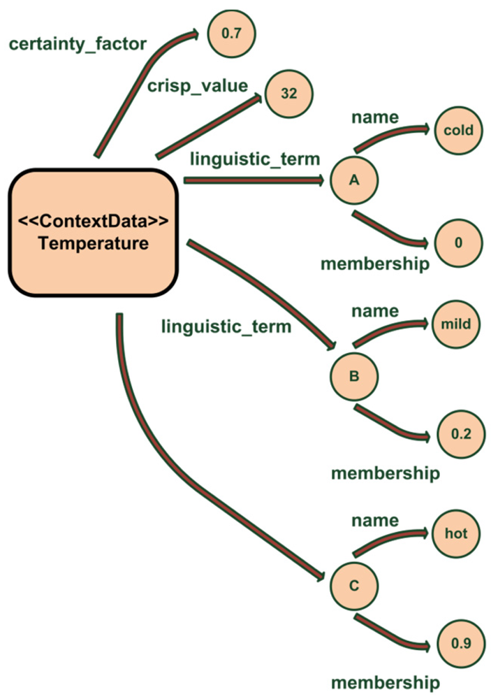 Our ontology models two aspects of the ambiguity of the context data: the uncertainty (represented by a certainty factor, CF) and the vagueness (represented by fuzzy sets). Uncertainty models the likeliness of a fact, for example “the temperature of the room is 27 °C with a certainty factor of 0.2 and 18 °C with a certainty factor of 0.8” means that the value of the temperature is more probably 18 °C (but it cannot be both of them). In the case of vagueness it represents the degree of membership to a fuzzy set. For example “the temperature of the room is cold with a membership of 0.7” means that the room is mostly cold. In Figure 2 it can be seen how those values are stored in the ontology. Each ContextData individual has the following properties: