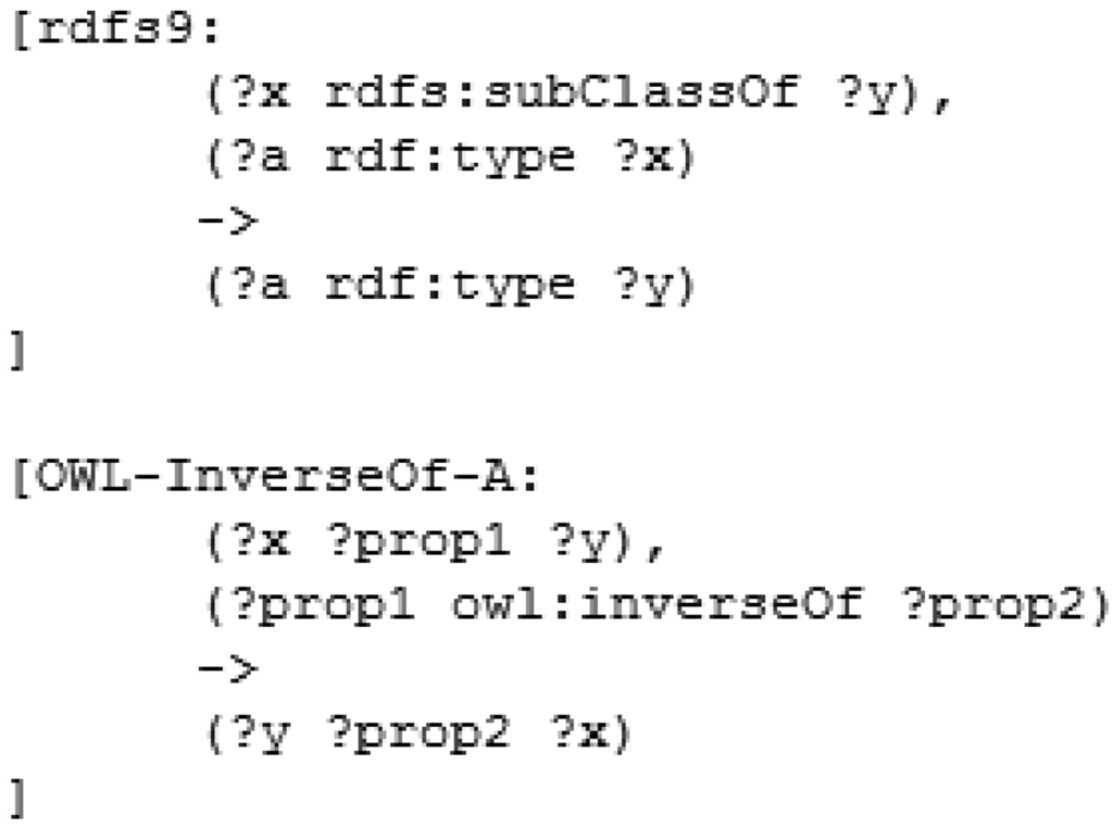 Once the measurements have been added, we apply a semantic inference process to achieve two goals: make explicit the hidden implicit knowledge in the ontology and infer the positional information of each measurement. To do this we use two different sets of rules: the semantic rules and the spatial heuristic rules. To make the semantic reasoning less cumbersome we implement a subset of the RDF Model Theory [24] and the OWL Model Theory [25]. An example of the used rules can be seen in Figure 4.