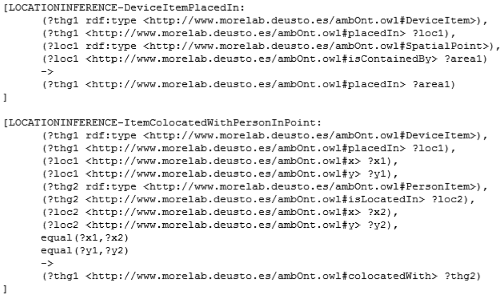 The spatial heuristic rules are used to infer higher level spatial information from the coordinates provided by the sensors. This information comprises data like the room in which the sensor is located; the devices, people and sensors surrounding it and the relative location to other LocableThing-s (refer to Section 3 for more information about the elements of the ontology). An example of the used rules can be seen in Figure 5. In the first rule a device's area of location is inferred using its (x,y) coordinates. The second rules checks if a device and a person are in the same position.