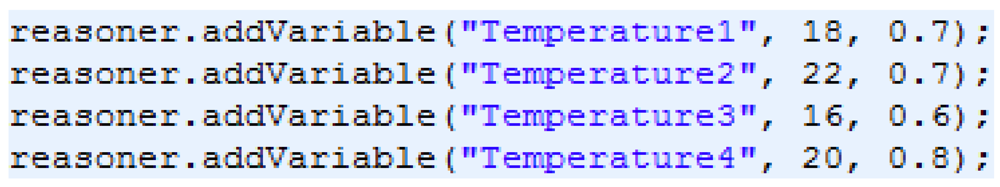 The modified reasoner supports two types of uncertainty: uncertain data and uncertain rules. The first type occurs when the input data is not completely reliable (as seen in the example shown in Table 1). To support this type of uncertain data we have modified the API of the reasoner (see Figure 6).