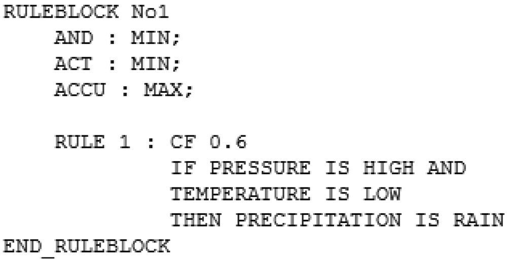 The second type of uncertainty takes place when the outcome of a rule is not fixed, for example “if the barometric pressure is high and the temperature is low there is a 60% chance of rain”. To model this aspect of uncertainty we have modified the grammar of the FCL language. An example of the modified rules can be seen in Figure 7.