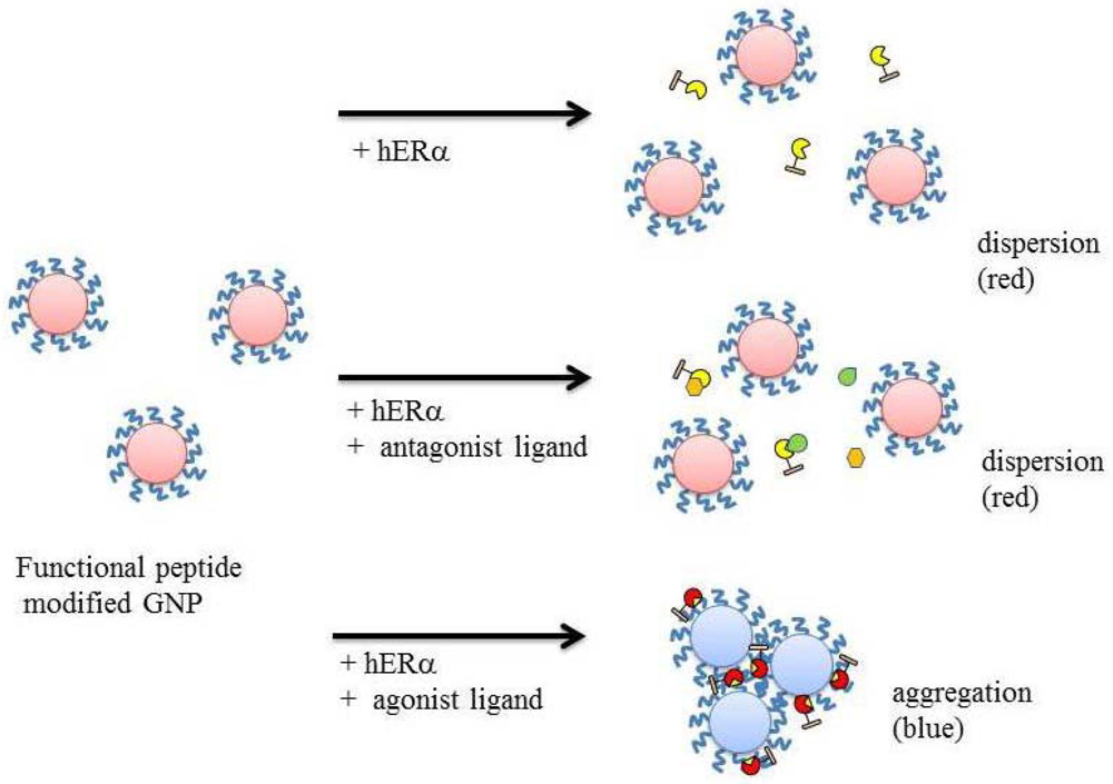 In this manuscript, we report and discuss a smart assay method using functionalized (molecularly modified) GNPs for ligand screening of human estrogen receptor alpha subtype (hERα). A synthetic peptide containing the LXXLL motif of SRC-1 can be employed as a molecular-recognition element of ligand-activated nuclear receptors. This colloidal sensor was constructed to utilize a modified SRC-1 peptide on the GNP surface for measurement purposes. When ligand-activated hERα forms complexes with functional GNPs, the absorption spectrum of the solution is changed by a decrease of the colloidal stability in the solvent. In this study, we have developed and demonstrated the utilization of this phenomenon for a colorimetric biosensor, and then discussed its application for HTS of nuclear receptor ligands in drug discovery.