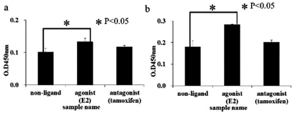 First, we investigated complex formation between functional peptide and hERα with or without ligand, as shown in Figure 2. This figure shows the affinity assay of synthesized peptides with hERα activated by agonist ligand using the affinity assay kit. The agonist ligand (E2) sample shows a higher level of optical density than the other samples [with no ligand or antagonist ligand (tamoxifen)] and shows a significant difference in this regard compared with the other samples. Accordingly, the synthesized functional peptides were expected to have ligand selectivity for hERα and form a specific complex with estrogen receptor.