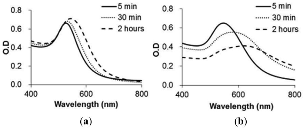 Figure 4 shows the absorption spectra of GNP-FP1 and 2 with hERα activated by agonist ligand (E2) for each reaction time. Both spectra were shifted to the right by mixture with activated hERα over time. The results showed that the spectrum of GNP-FP2 (Figure 4(a)) changed faster than that of GNP-FP1 (Figure 4(b)). This indicates that FP2 more efficiently formed a complex with hERα activated by agonist ligand on GNPs than FP1. For GNP-FP1, specific complexes between FP1 and activated hERα were not formed efficiently on GNPs because the hydrophobic sequences of FP1 caused non-specific adsorption to the GNP surface. However, in the case of FP2, PEG of FP2 inhibited non-specific adsorption by hydrophobic sequences. Hence, GNP-FP2 aggregated faster than GNP-FP1 by the specific formation of complexes with hERα activated by agonist ligand.