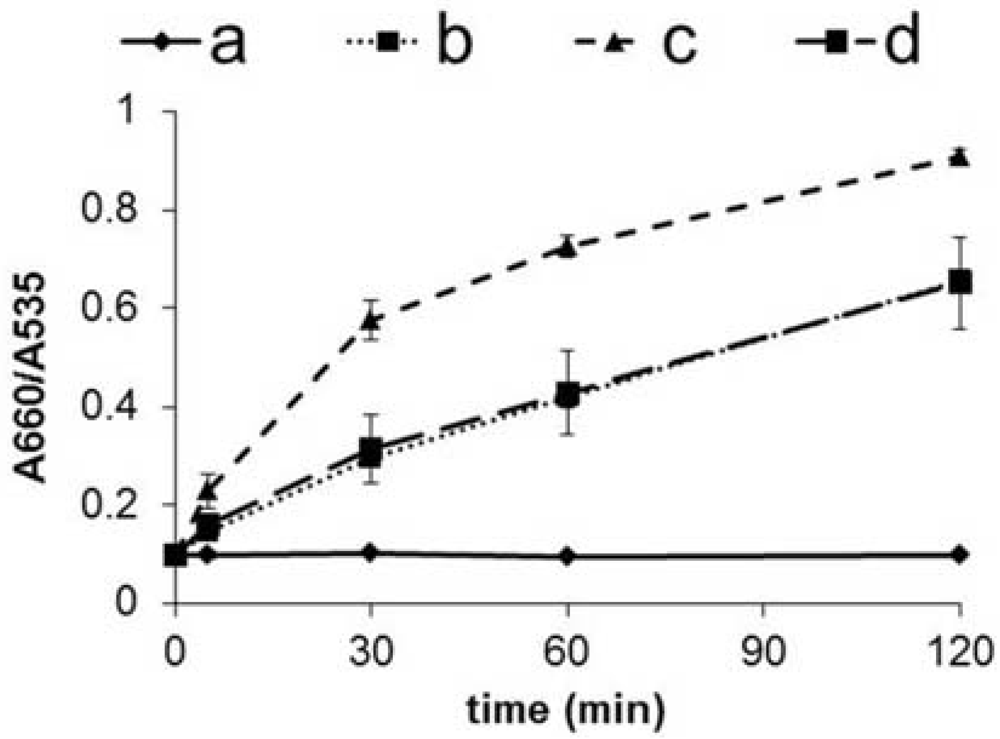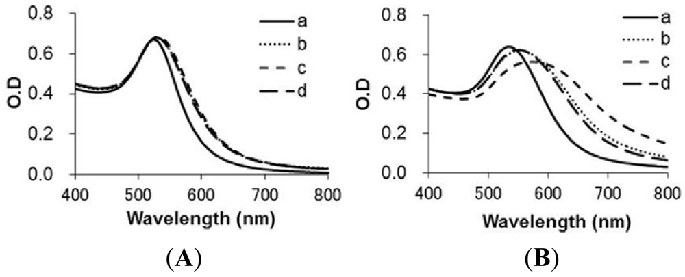 In this study, we have focused on gold nanoparticles (GNPs) as a signal transducer that enables the affinity interaction between a nuclear receptor and agonist ligands to be detected by shifts in the absorption spectrum. GNPs have unique optical, electrical, and magnetic properties []. In particular, the optical spectra of GNPs show a localized surface plasmon band in the region of 520–550 nm. The absorption spectrum of GNPs changes drastically when several particles aggregated []. Various types of GNPs based sensors (DNA, antibody, polymer) [–] have been developed to take advantage of this property.