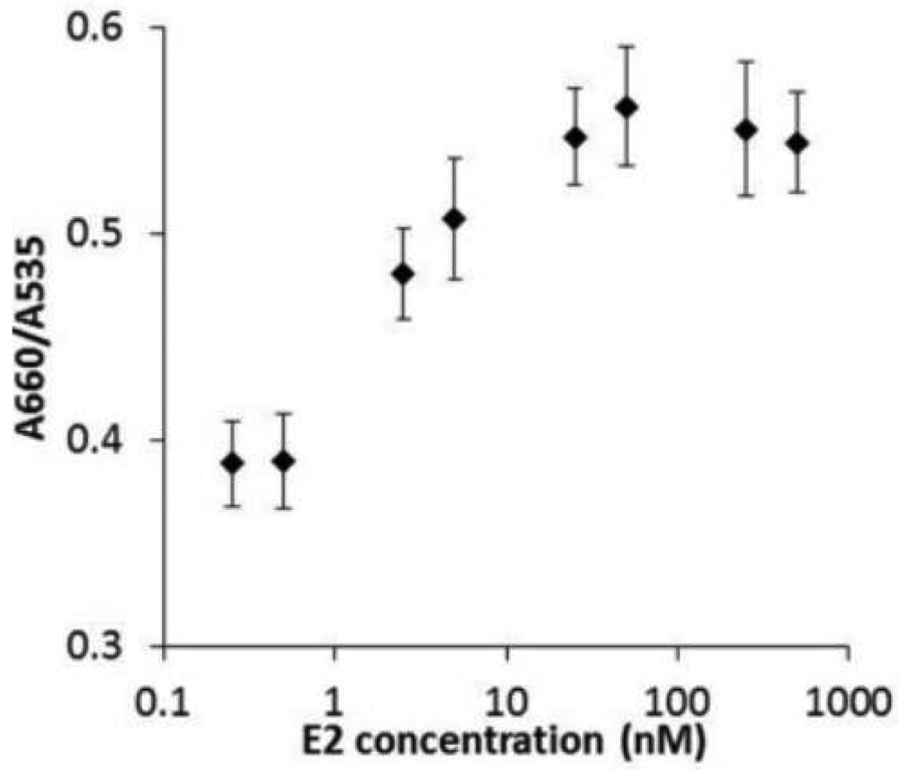 Using GNP-FP2, we attempted to determine E2 concentrations by the sensor response, which was measured 30 min after the reaction of activated hERα with E2 (Figure 7). Figure 7 shows relation between E2 concentration and sensor response. The plots clearly showed sigmoid curve. Below 0.5 nM, the sensor response is not enough to determine E2 concentration. However, between 0.5 nM to 25 nM, the sensor response is linear against E2 concentration. In the higher concentration than 25 nM, the response reachs a plateau. This finding showed why hERα concentration is constant 45 nM in every concentration of the ligand. Therefore, the plateau of response is between approximately 25 nM to 50 nM. because hERα and E2 were reactive at a ratio of 1:1.
