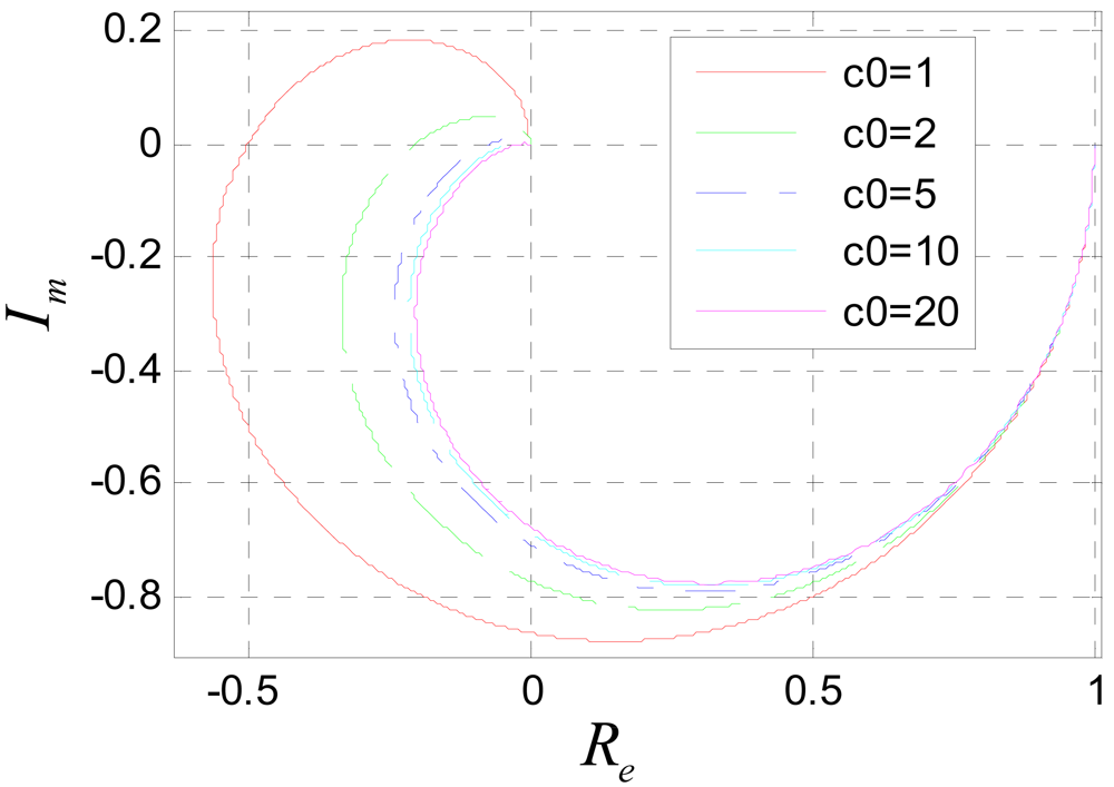 To avoid frequency aliasing, according to Shannon's sampling theorem, it should be satisfied that ùT < ðrad. So only the frequency characteristics under the condition ùT < ðrad are studied. Figure 11 shows the amplitude-frequency characteristic of system (31) when c0 is assigned to different values. It can be seen that the system is a low pass filter. The bigger c0 is, the lower the pass band is. According to the amplitude-frequency characteristic diagram, to make the amplitude of the filtered signal be approximate to that of the original signal, it should be satisfied that c0ùT ≪ ðrad. Usually, the position signal of maglev train satisfies this requirement. Figure 12 is the Nyquist diagram of Equation (31).