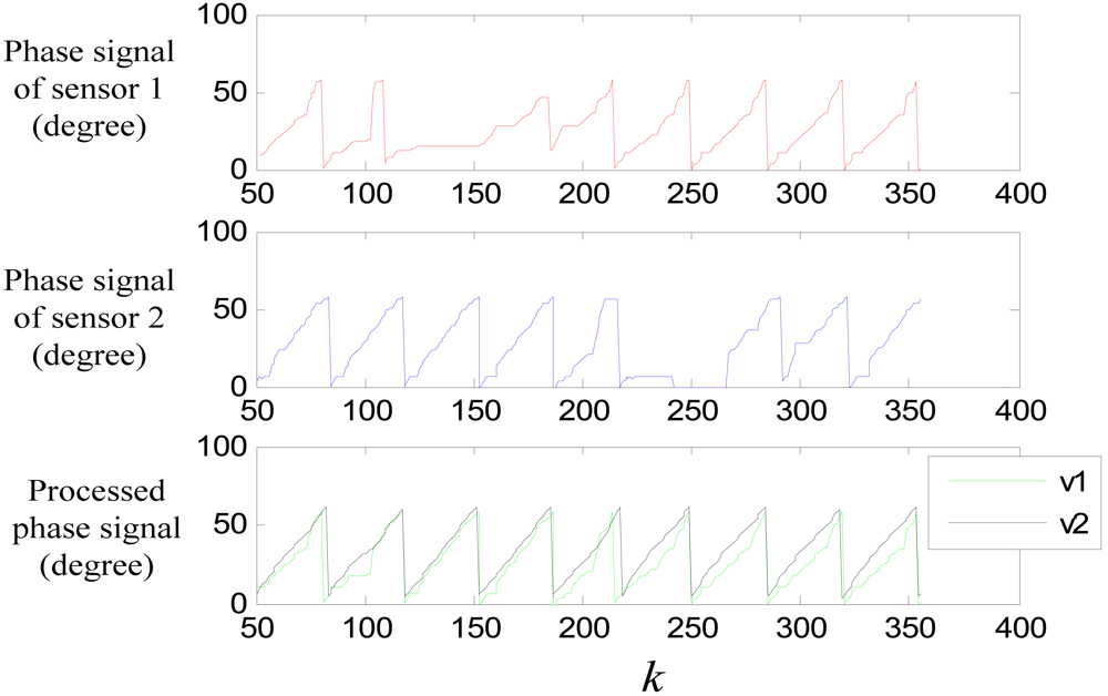 It can be seen that the smoothing effect is good, but the time delay is serious which will result in considerable positioning errors. Figure 21 shows the results after time delay compensation, where v2 is the compensated signal. It can be seen, the phase waveform is improved obviously after the procedure.