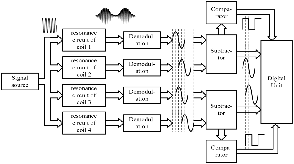 According to the relative location between the two coils in one group shown in Figure 2, the phase difference between the two demodulated signals of the two coils is 180°, shown in Figure 3. The two demodulated signals of one coil group are input into a subtractor amplifier to get their difference signal. The subtraction process can eliminate common-mode disturbances such as temperature drift. The difference signal has a better waveform and is more approximate to an ideal sine wave. According to the relative locations among the four coils, the phase difference between the two difference signals is 90°. Square waves can be obtained by putting the difference signals into comparators. The tooth-slot period number passed by the train can be gotten by counting the jumping edges of the square waves, and the phase relationship between the two square waves indicates the running direction. The phase relationship shown in Figure 3 corresponds to the situation where the sensor is moving in the direction indicated by the arrowhead shown in Figure 2.