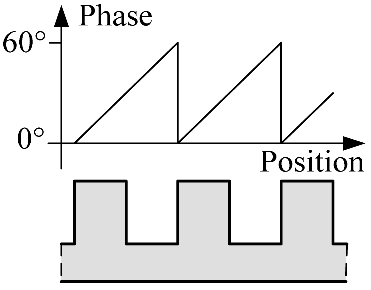 A magnetic pole phase period of the 3-phased windings contains six tooth-slot periods as shown in Figure 1. Thus, the length of a tooth-slot period corresponds to an electrical angle of 60° shown in Figure 4. The difference signals in a tooth-slot period are shown in Figure 5.