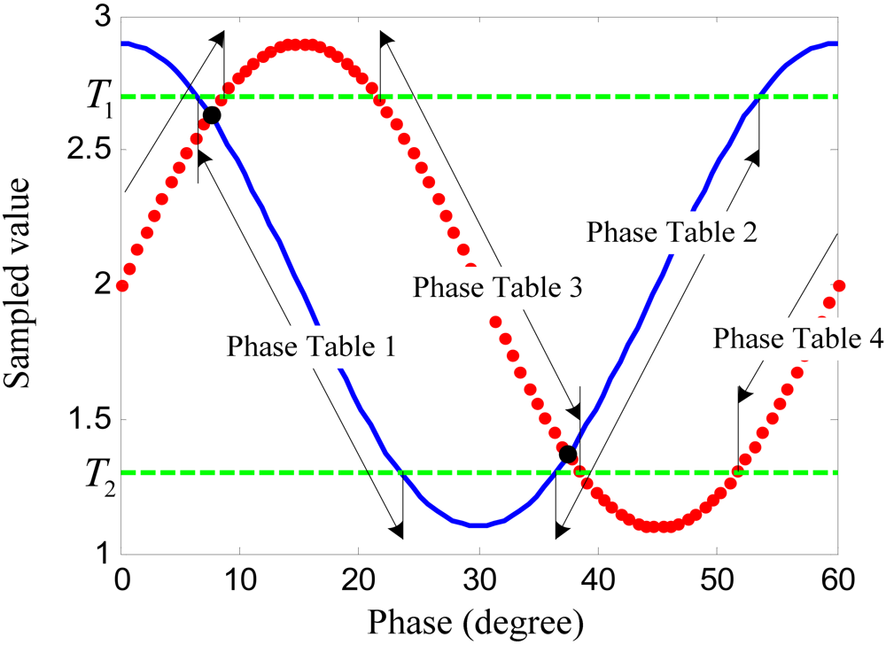 The data shown in Figure 5 can be used as a look-up table. Using the current sampled values of the difference signals as the indexes, the current phase can be found out from the table. However, there are some problems with the lookup phase using only one of the two sampled signals, because the signal is not monotonic and the rate of slope near the peaks and troughs is too small. Therefore, a multiple-table lookup algorithm is proposed.