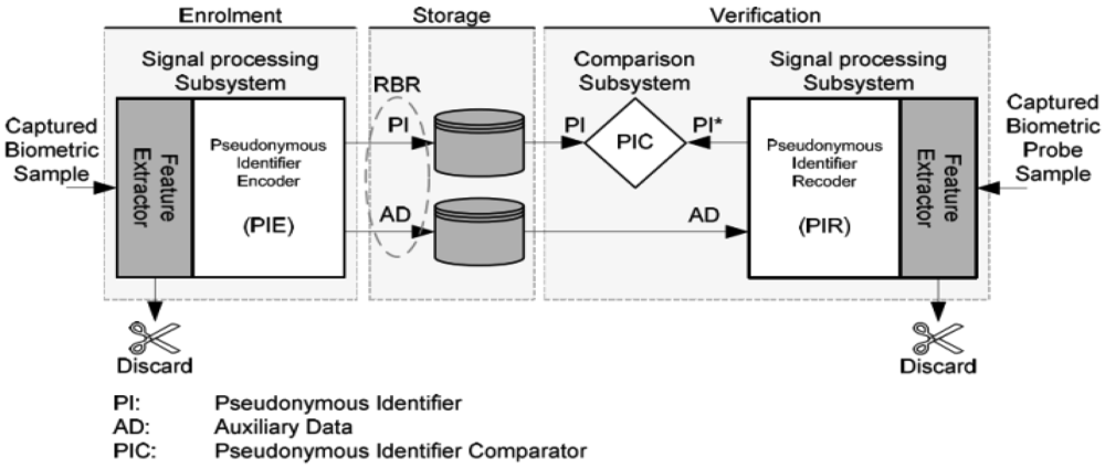 A Pseudonymous identifier (PI) derived from biometric features is defined in [11] as “part of a renewable biometric reference that represents an individual or data subject within a certain domain by means of a protected identity that can be verified by means of a captured biometric sample and the auxiliary data (if any)”. The Auxiliary Data (AD) is defined in [11] as “subject-dependent data that is part of a renewable biometric reference and may be required to reconstruct pseudonymous identifiers during verification or for verification in general”. Simply to say, for a typical biometric template protection algorithm, PI is used as an identifier to a subject and for direct comparisons; AD is used for PI recoding or new PIs' reconstruction (i.e., diversification). PI and AD can be separated logically or even physically in a practical system. Existing template protection mechanisms can be well mapped into this reference architecture (seen in Table D.1 in Annex D of [11]).