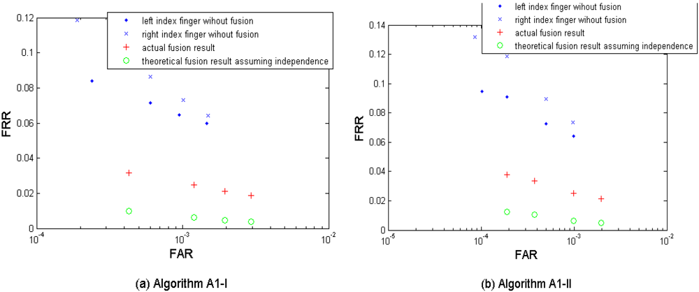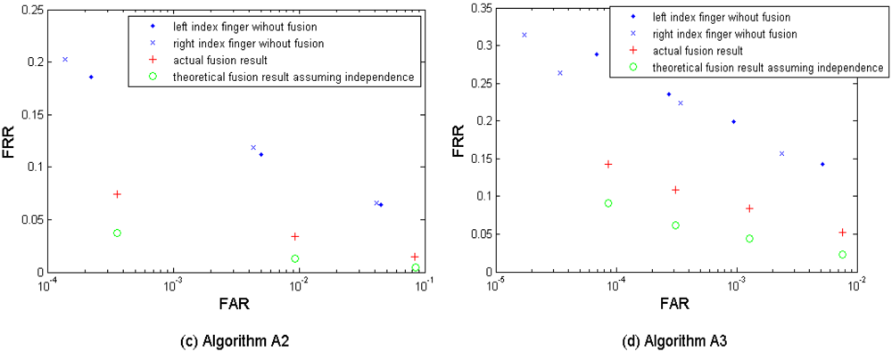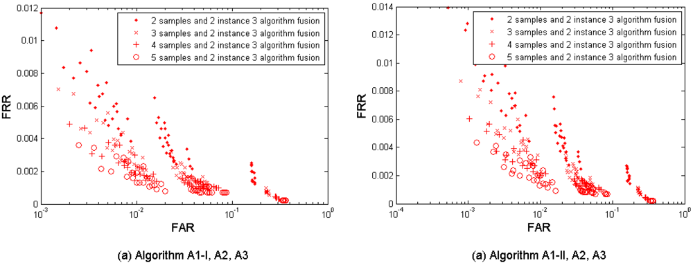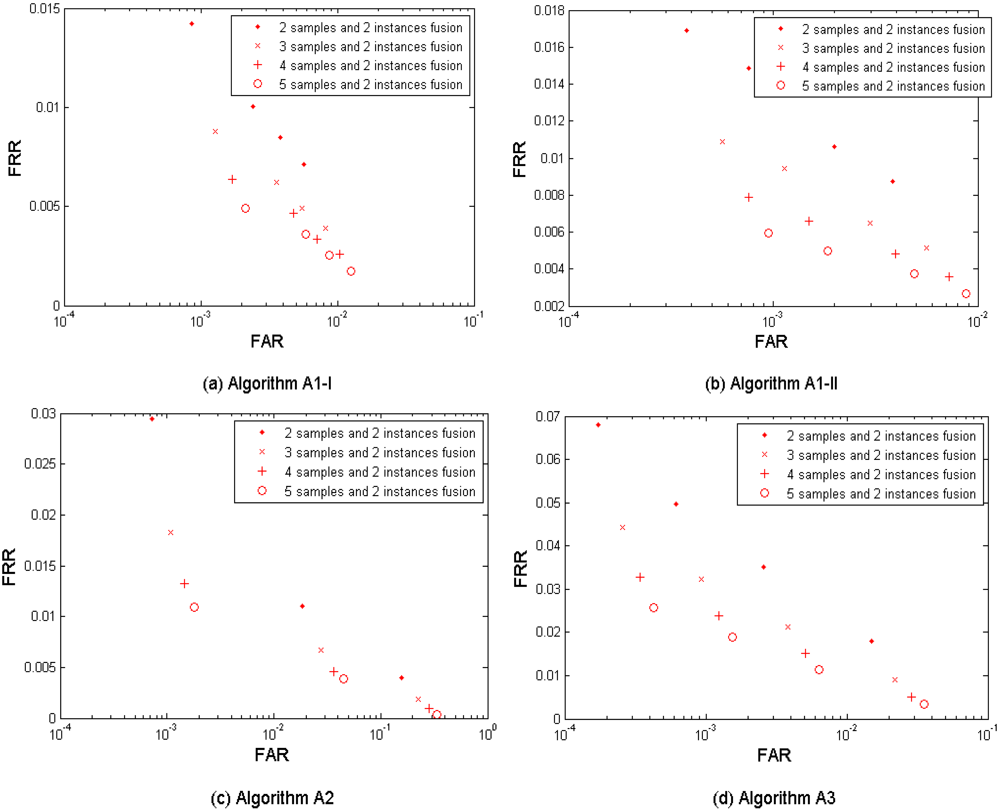 Figure 9(a–d) show the multi-sample-instance fusion results from the left and the right index fingers by fusing M = 2, 3, 4, and 5 samples and using the algorithms A1-I, A1-II, A2, and A3. Table 9 shows the performances which are closest to the target (FRR ≤ 1%, FAR = 0.1%) when fusing the two index fingers.