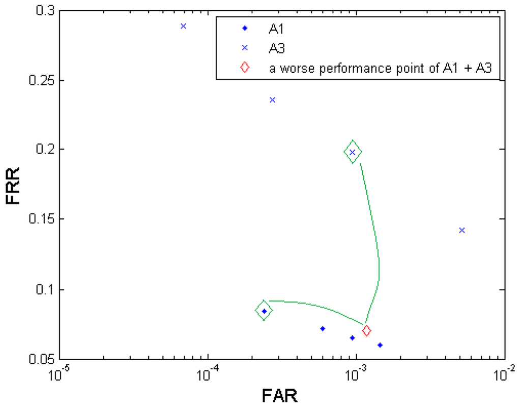 A: In most cases decision-level fusion results in a better biometric performance if the two tested elements for fusion have similar biometric performance (small performance gap) on their own [25]. The amplitude of performance improvement depends on the dependency between the two elements. In our experiments, almost all the generated fusion results excel their primary elements. But we can still find some exceptional cases of performance degradation, e.g., in the multi-algorithm fusion test (Figure 4), the resultant fusion operation point (FAR = 0.0012; FRR = 0.0703), which is obviously worse than A1's performance in general, is generated from two primary operation points (FAR = 0.0002; FRR = 0.0840) in A1 and (FAR = 0.0009; FRR = 0.1985) in A3. In this case, the point (FAR = 0.0009; FRR = 0.1985) has a distinct performance gap from the point (FAR = 0.0002; FRR = 0.0840) in both FAR and FRR in the same time, which leads to performance degradation compared to the stronger biometric test A1. Figure 11 illustrates this performance degradation example. Fortunately in our experiments, such large-performance-gap tests were rarely observed.