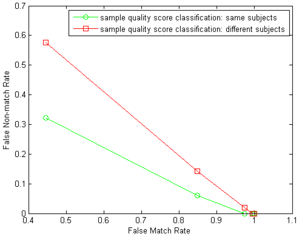 A: Instances, if being assumed of no distinct performance gap among each other, however, seems not completely independent among each other under the decision level fusion tests. We can see this clearly from Figure 6. This might be attributed to the correlation in fingers' physiological quality from the same subject. We investigated this correlation by comparing the NFIQ fingerprint quality scores [27] of the left-index-finger samples and the right-index-finger samples in our experiments–first, we form a genuine distance group by calculating the absolute values of the NFIQ score differences of the two same-subject index fingers from the 100 subjects and then form an imposter distance group by calculating the absolute values of NFIQ score differences of any two different-subject index fingers from the 100 subjects. Then classification of the two distance groups can show the correlation of the two instances from the same subject. In our test, on samples from 10 sessions in the GUC100 database, the average classification performance point closest to the Equal-Error-Rate (EER) (note that due to the narrow dynamic range of NFIQ scores (only 1∼5) an accurate EER was not able to obtain) achieves FMR = 0.5054 while FNMR = 0.3460. For comparison, we form another two distance groups for classification in which all distances are calculated from different subjects and this classification test achieves FMR = 0.5054 while FNMR = 0.4950 in average from 10 sessions. Now we can see the noticeable correlation in sample quality between the two same-subject instances from the former classification test. An example of the two classification results (DET curves) from one session in the GUC100 database is shown in Figure 12.
