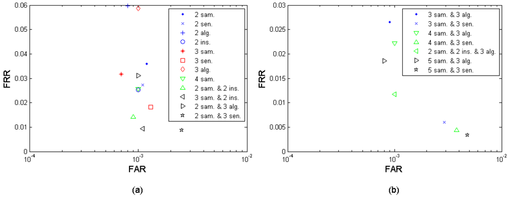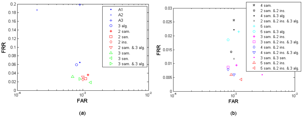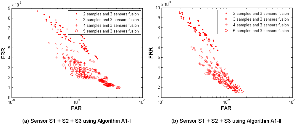 Figure 10(a–b) show the multi-sample-instance-algorithm fusion results from the left and the right index fingers by fusing M = 2, 3, 4, and 5 samples and fusing all three algorithms A1-I, A1-II, A2, and A3. Table 10 shows the performances which are closest to the target (FRR ≤ 1%, FAR = 0.1%) in this fusion scenario. Since each algorithm provides four performance points, fusing the three sensors results in 4 × 4 × 4 = 64 performance points. It is observed that the performance can be improved by increasing the number of samples used for fusion. This fusion test resulted in better performance than its single-layer fusion scenario (1) multi-sample, (2) multi-algorithm, and (4) multi-instance, but only marginally better (while M = 2 and 3) and no better (while M = 4 and 5) than the performance of the fusion scenario (7) multi-sample-instance.