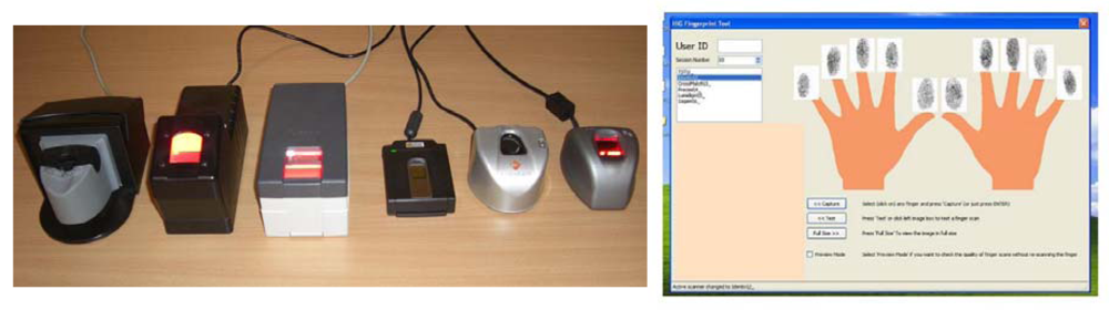 The GUC100 fingerprint database contains fingerprint samples collected in Norway in the winter-spring season of 2008. The samples are challenging in quality due to the cold and dry Scandinavian weather conditions, even though the collection took place inside a standard office room. This database was predominately used for testing purposes in the course of the TURBINE project and is also freely available to other researchers provided that testing is conducted at the GUC (Gjøvik University College) premises. It is a multi-sensor fingerprint database which had been created for independent and in-house performance and interoperability testing of third party algorithms. The samples were collected by six different fingerprint sensors, namely the TST BiRD 3, L-1 DFR 2100, Cross Match L SCAN 100, Precise 250 MC, Lumidigm V 100 and Sagem MorphoSmart (as shown in Figure 2 from left to right). Over several months, fingerprint samples from 12 sessions of all 10 fingers from 100 subjects (aged from teens to seniors with both genders balanced) on all six sensors were collected. This should result in 72,000 fingerprint images, but in practice only 71,994 valid images were recorded finally (the other six images are either from wrong fingers or are duplicates caused by software bugs and were thus removed).