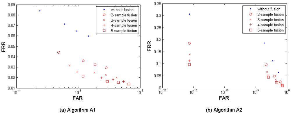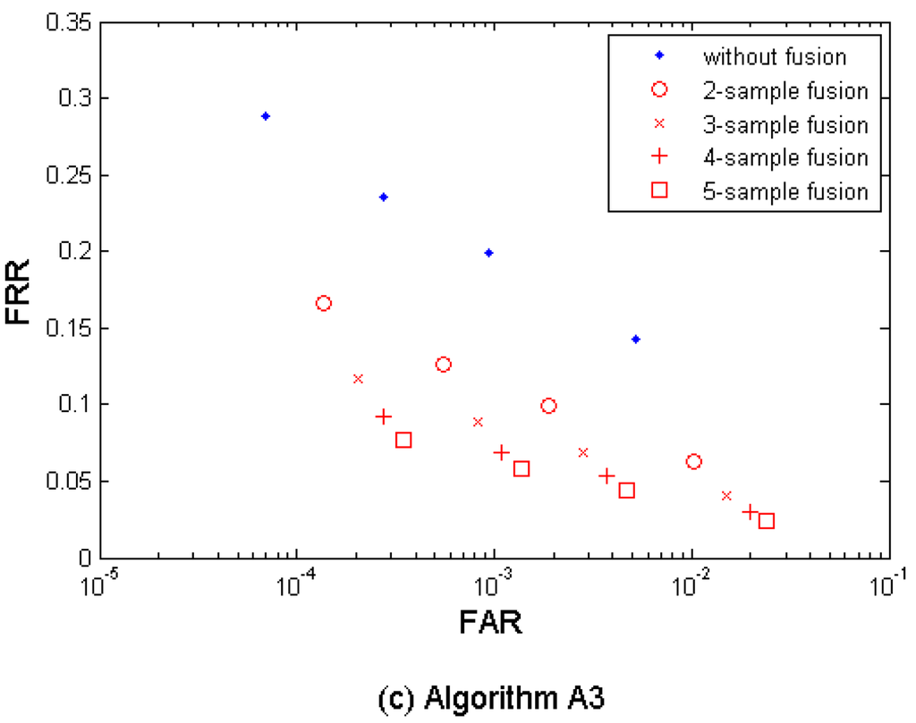 Figure 3(a–c) shows both the performance without fusion and the biometric performance of the multi-sample fusion by the algorithm A1, A2, and A3. Table 3 shows the performances which are closest to the target (FRR ≤ 1%, FAR = 0.1%) by the three algorithms. In the results, M = 2∼5 samples from neighboring sessions were used for fusion. It is clear to notice that the performance can be improved by increasing the number of samples used for fusion.